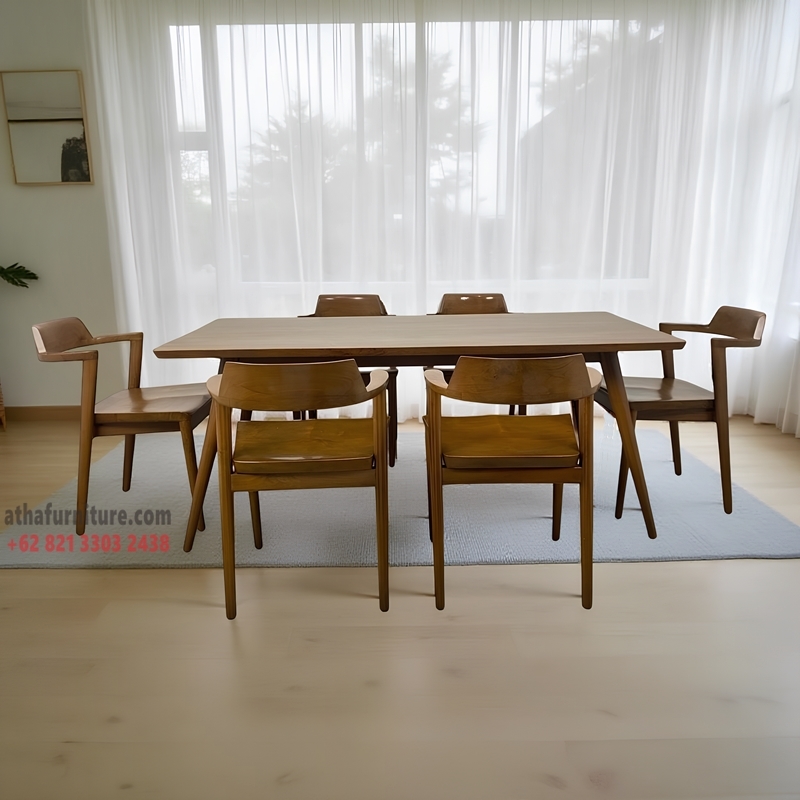 Discover the beauty and comfort of the Nairobi dining table set made of quality teak wood, consisting of 1 long table and 6 dining chairs with a smooth finish, the result of skilled handiwork from Jepara Indonesia furniture manufacturers who have been widely recognized as the center of the best wood furniture in the world, presenting an elegant, strong and durable design to beautify the dining room. Which provides a warm dining experience with family and guests. The best choice for those of you who are looking for a Jepara wood dining table set with premium quality, competitive prices, and beauty that can last for decades.